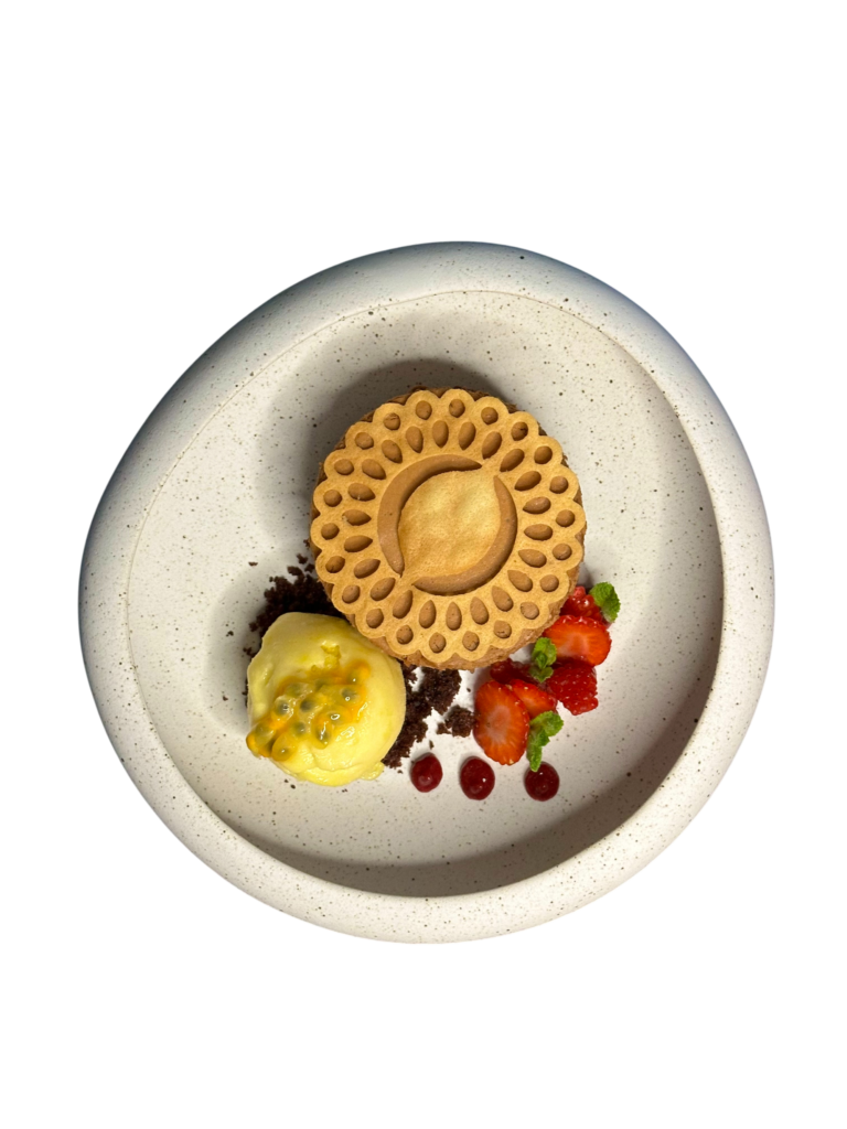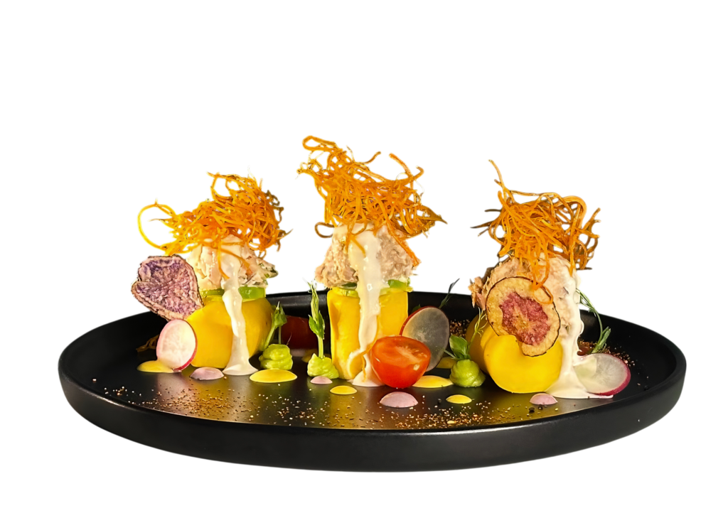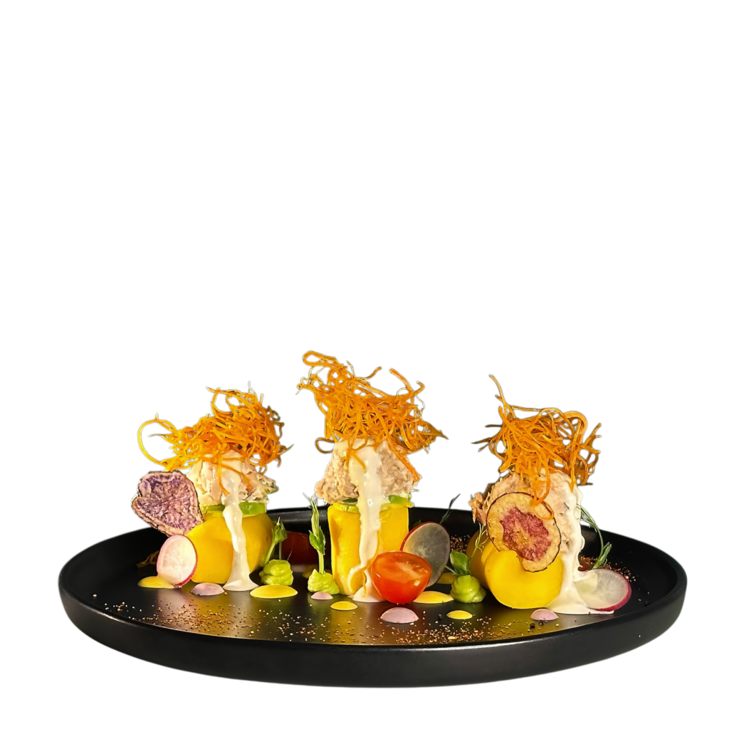Notre menu est conçu comme un voyage sensoriel à travers le Pérou profond : des saveurs qui évoquent les marchés de Lima, les vents du Pacifique, les hauteurs andines et les mystères de l’Amazonie. Et notre dessert signature, « mousse de copoazu », est la parfaite synthèse entre innovation et tradition : un hommage en textures à la chicha morada, boisson ancestrale et symbole d’unité.