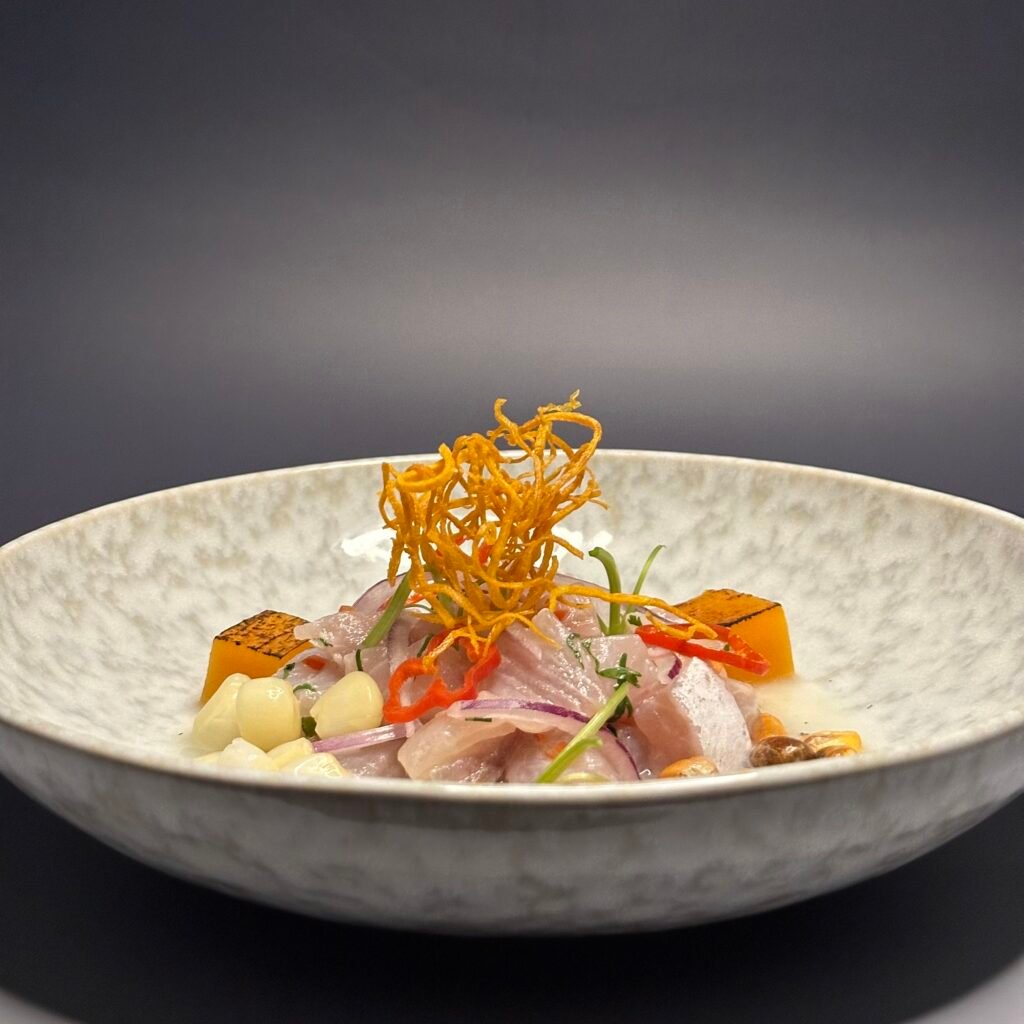 Notre spécialité, ce sont les ceviches et tiraditos — réinterprétés avec une approche gastronomique contemporaine. Chaque plat naît de la rencontre entre un produit d’exception et une créativité respectueuse. Nous utilisons des ingrédients authentiques du Pérou — piments, maïs, poissons, agrumes et herbes ancestrales — rigoureusement sélectionnés à la source, que nous marions aux produits frais du terroir suisse.