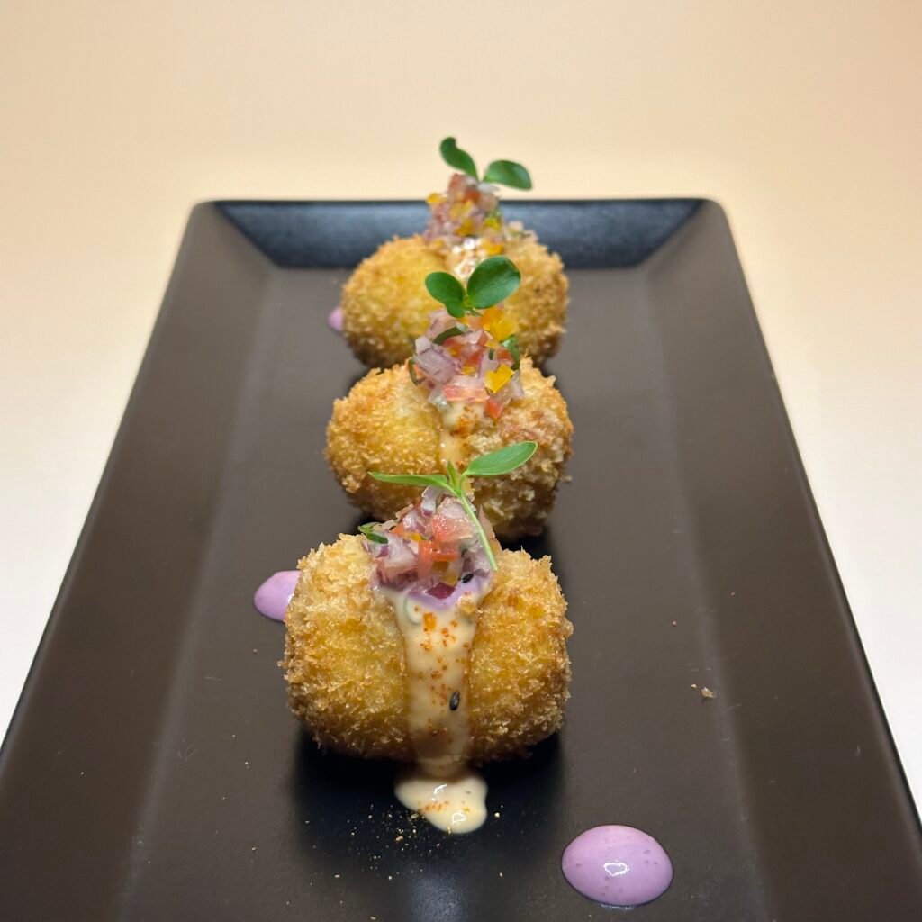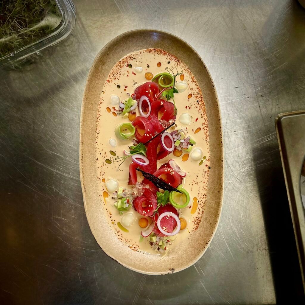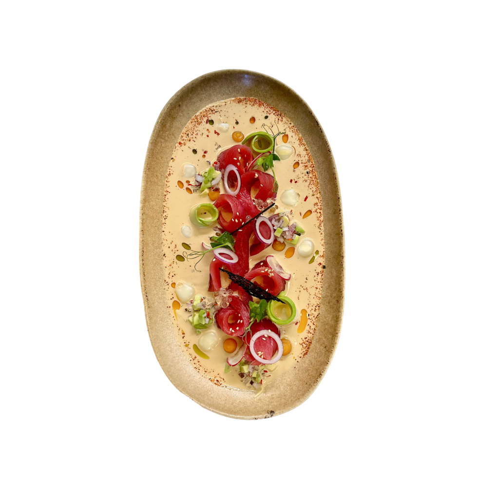 Lamelles de thon, avec sauce Nikkei, soja, huile de sésame, crème de rocoto, citron vert, chalaquita d’ avocat, perles de yuzu et caviar de rocoto.